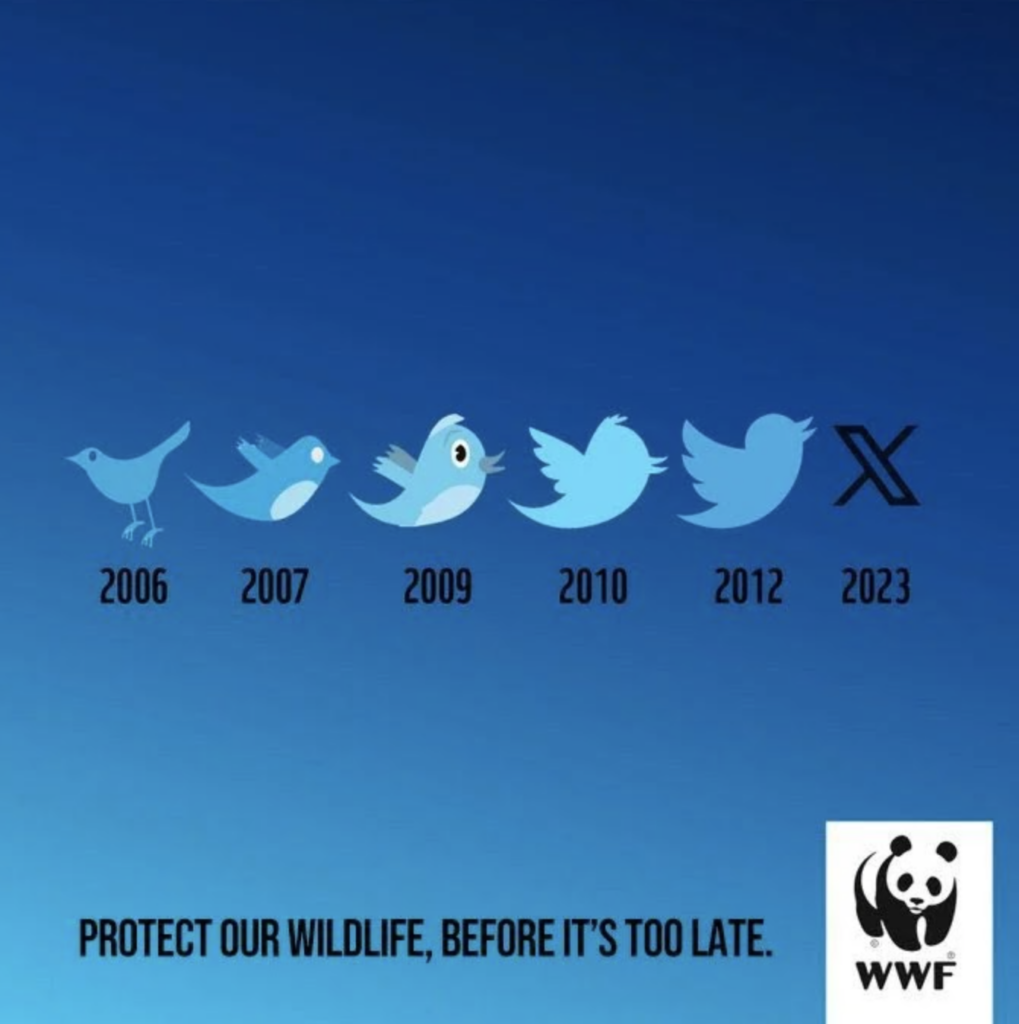 One of the best examples comes from the World Wildlife Fund (WWF). They used Twitter’s rebranding to “X” to creatively reinforce their environmental message. The visual showed the evolution of Twitter’s logos over time, turning the iconic bird into “X,” implying the loss of species and biodiversity. It was timely, very much on point, and emotionally resonant – an excellent example of a response to a pop culture moment by still staying true to the mission and tone of voice of a formal institution!